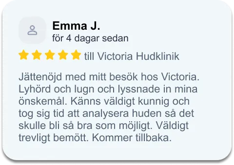På Victoria Hudklinik är vårt mål är att erbjuda personligt anpassade behandlingar som speglar just dina skönhetsmål.